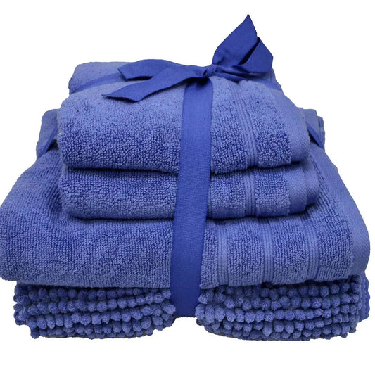 Four Pack Chenille Bath Mat & Towel Bundle Ribbon Tied - Blue