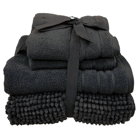 Four Pack Chenille Bath Mat & Towel Bundle Ribbon Tied -Charcoal