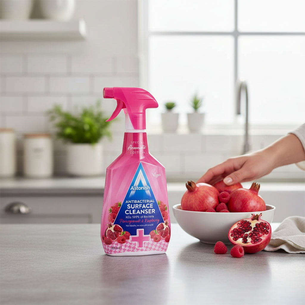Meet the Astonish Trigger Spray 750ml Aromatic Surface Cleanser AntiBac in Pomegranate & Raspberry — a scent-smart, everyday cleaner that tackles grime and germs while leaving a bright, fruit-forward aroma in its wake. Built for real-life kitchens, bathrooms, and living spaces, this versatile spray brings both function and fragrance to your cleaning routine.