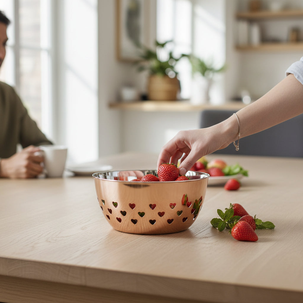 The Hearts Design Stainless Steel Bowl reimagines a everyday fruit bowl as a sculptural centerpiece. With three distinct layers of heart-shaped cut-outs, this contemporary piece brings playful charm to any kitchen or table while staying firmly practical for daily use.