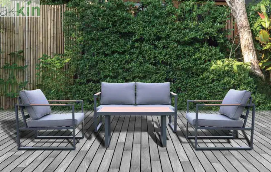 Aluminium powder coated frame|Heat transferred printing wood effect top|UKFR 230g/m2 spun polyester,8cm UKFR Piped seat cushions|Single lounger H67cm, W67cm, D75cm|2 Seat Sofa H67cm, W75cm, D127cm|Coffee table H45cm,W 58cm, D100cm